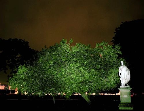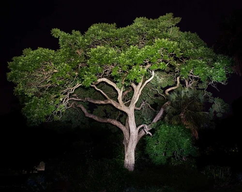 A tree of myth and legend associated with ancient writers and mariners who brought tales to Europe of the magical qualities of the blood-like resin of ancient gargantuan plants. Native to the Canary Islands, the resin of these trees has been traded since the fifteenth century and amongst other uses it was used for polishing violins. This tree was probably planted in the 1880s and developed a perfect symmetrical shape, until on the 2nd May 2008 it fell over. It has continued to grow, flower and fruit. This image actually shows the view of the underside of the tree, which is now lying on its side.